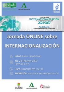 EXTENDA, la Agencia Andaluza de Promoción Exterior, en colaboración con el Ayuntamiento de Cúllar Vega y el Centro Guadalinfo de Cúllar Vega, ha organizado una JORNADA ONLINE gratuita sobre INTERNACIONALIZACIÓN dirigido a Empresas, Comercios y Emprendedores/as que tendrá lugar por videoconferencia el miércoles 23 de febrero de 2022 y cuyo objetivo es fomentar la internacionalización de empresas andaluzas.