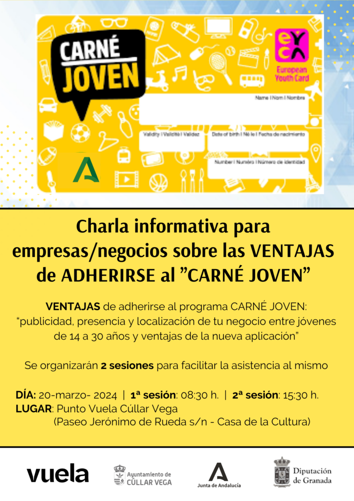 Durante la charla se informará sobre las ventajas de unirse al programa y se presentará la nueva aplicación, a través de la cual los jóvenes podrán encontrar todos los negocios y comercios asociados al CARNÉ JOVEN. Se destacarán aspectos como la publicidad, presencia y localización de tu negocio entre jóvenes de 14 a 30 años, así como las ventajas de esta nueva herramienta.