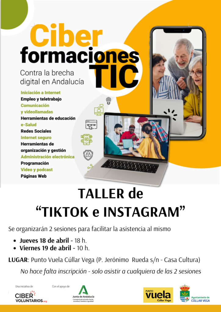 La Fundación Cibervoluntarios, con el respaldo de la Consejería de Inclusión Social, Juventud, Familias e Igualdad de la Junta de Andalucía y en colaboración con el Ayuntamiento de Cúllar Vega y el Punto Vuela Cúllar Vega, se complace en invitarles al taller gratuito sobre las dos redes sociales más influyentes en la actualidad: TIKTOK E INSTAGRAM, que se llevará a cabo los días jueves 18 y viernes 19 de abril.