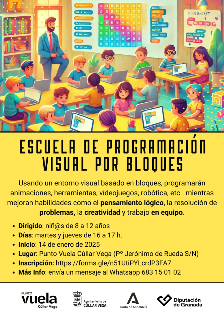 El 14 de enero dará comienzo la Escuela de Programación Visual por Bloques en el que niñ@s de 8 a 12 años, usando un entorno visual basado en bloques, aprenderán a programar animaciones, presentaciones, videojuegos, robótica, etc.. mientras mejoran habilidades como el pensamiento lógico, la resolución de problemas, la creatividad y trabajo en equipo.